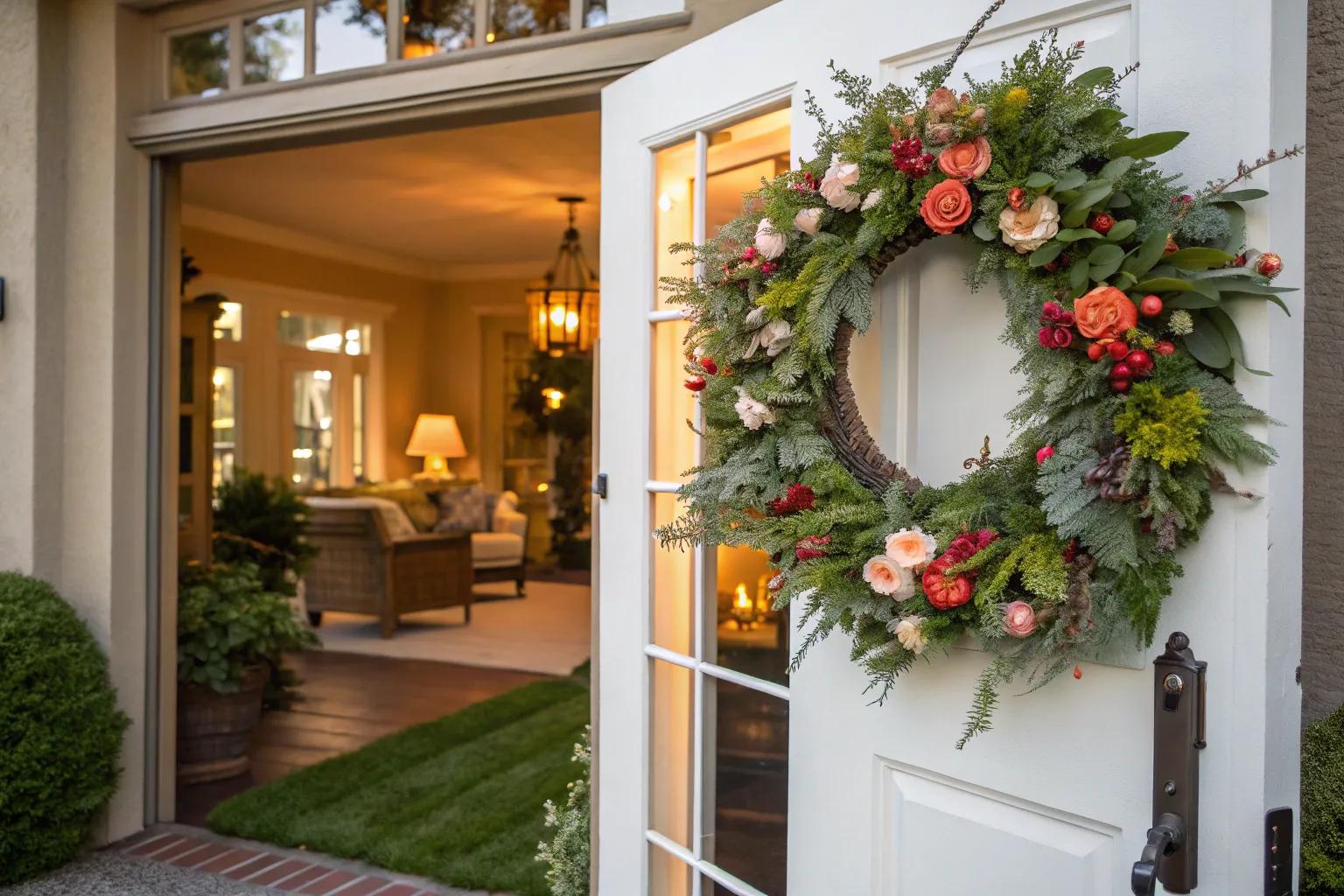 Incorporate vibrant fresh blooms such as roses or hydrangeas to infuse your wreath with lively color and natural fragrance. This approach is ideal for refreshing your decor during warmer months.