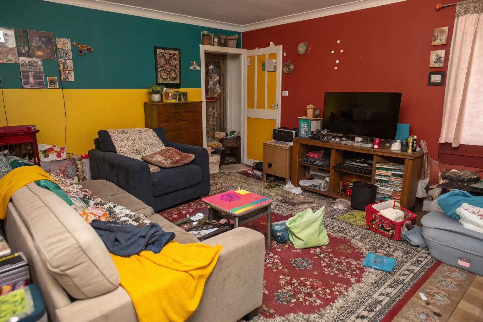 Room with a chaotic neon color scheme that clashes visually.