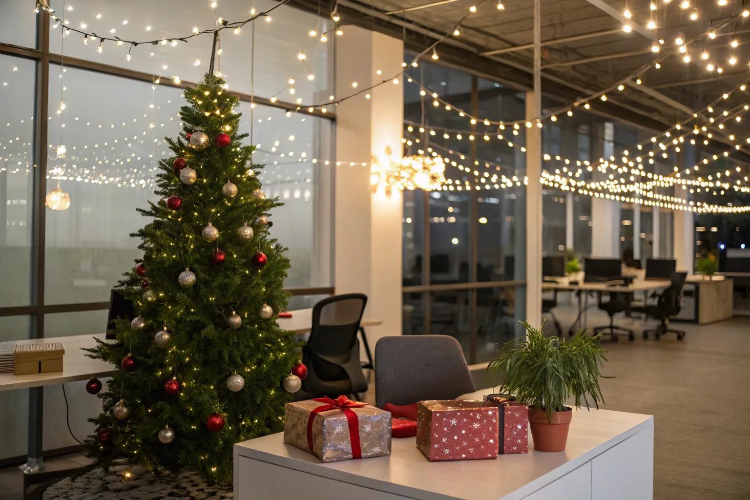 Drape fairy lights overhead in common areas to craft a warm, inviting holiday atmosphere. This setup was a standout feature at our recent office celebration.