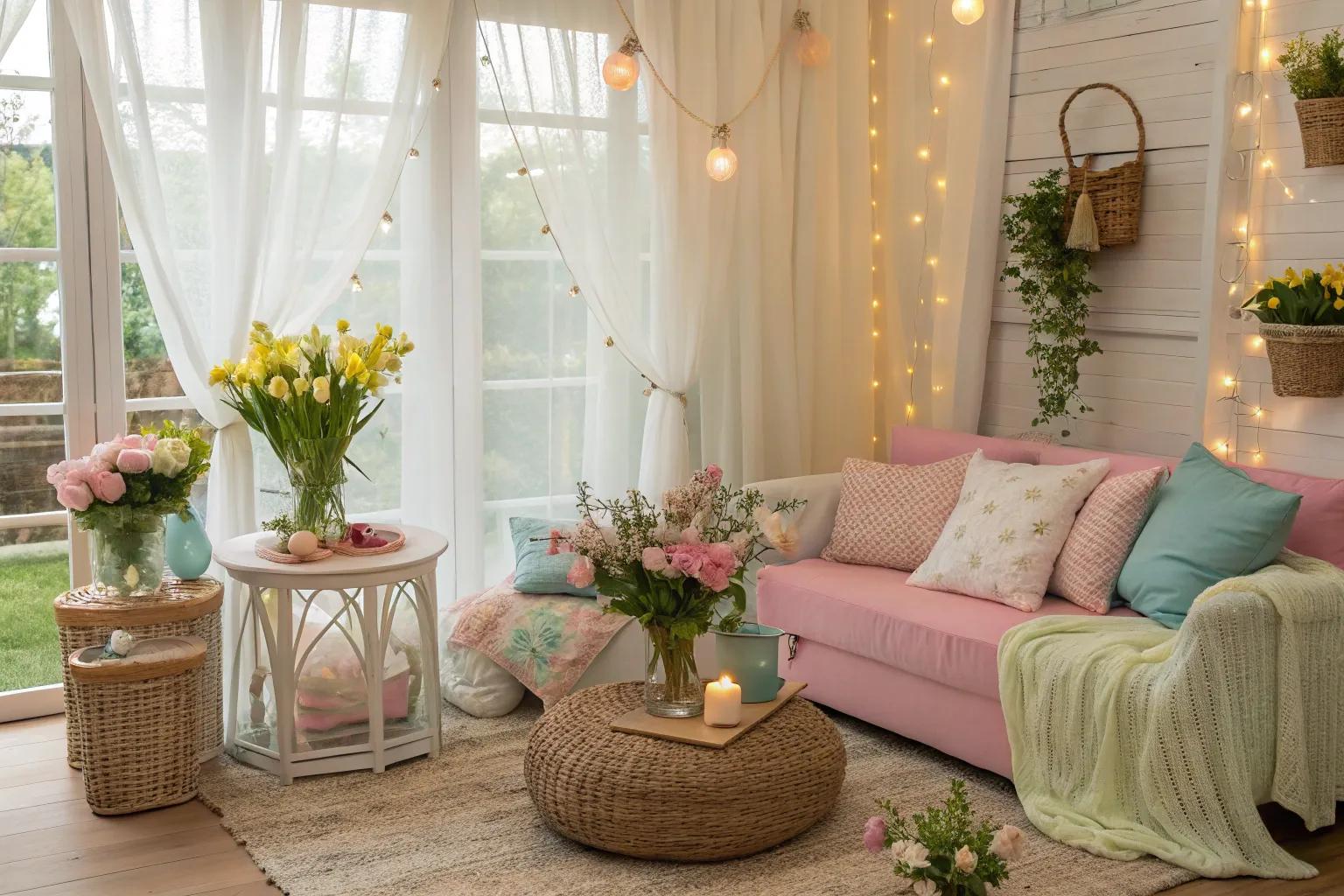 Curate a gallery wall featuring pastel-colored frames and spring-themed artwork to create a lively and personalized focal point.