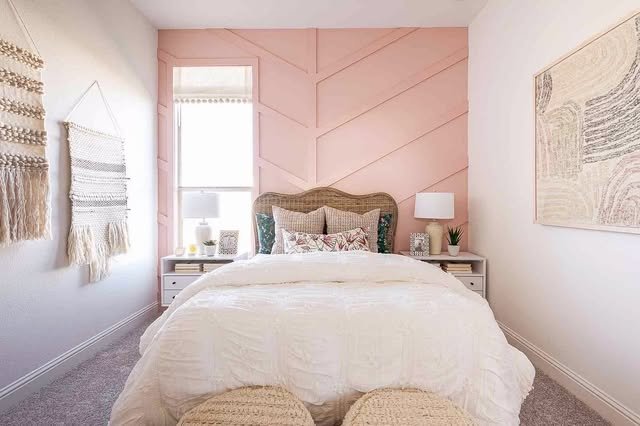 Bring the calming essence of the sea indoors by blending soft pinks reminiscent of coral with gentle blues and sandy beige accents. Incorporate natural textures like jute rugs and airy curtains to evoke a beachside retreat. This palette not only soothes but also adds a fresh, airy feel to a small bedroom.