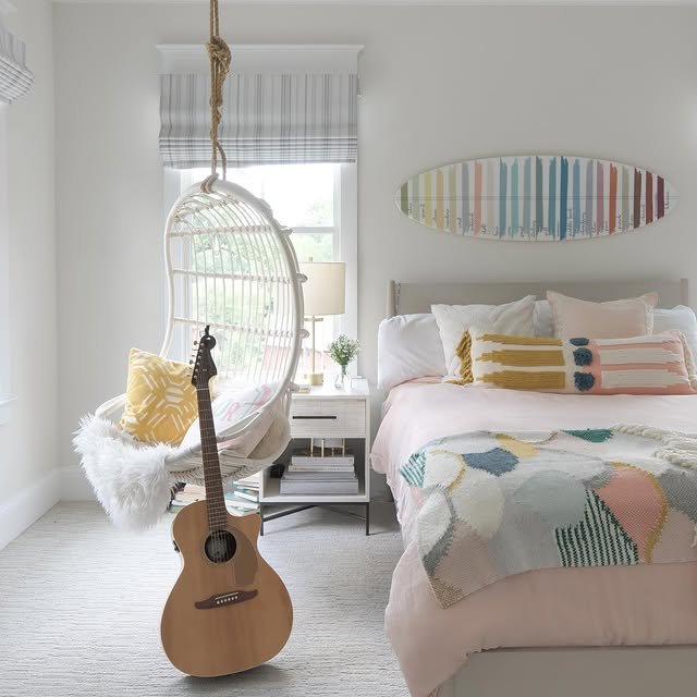 Introduce playful elements like a hanging swing chair to serve as a cozy nook, paired with adventurous decor such as a surfboard wall art. Utilizing vertical space for these features keeps the floor clear, balancing fun and functionality in a small room.