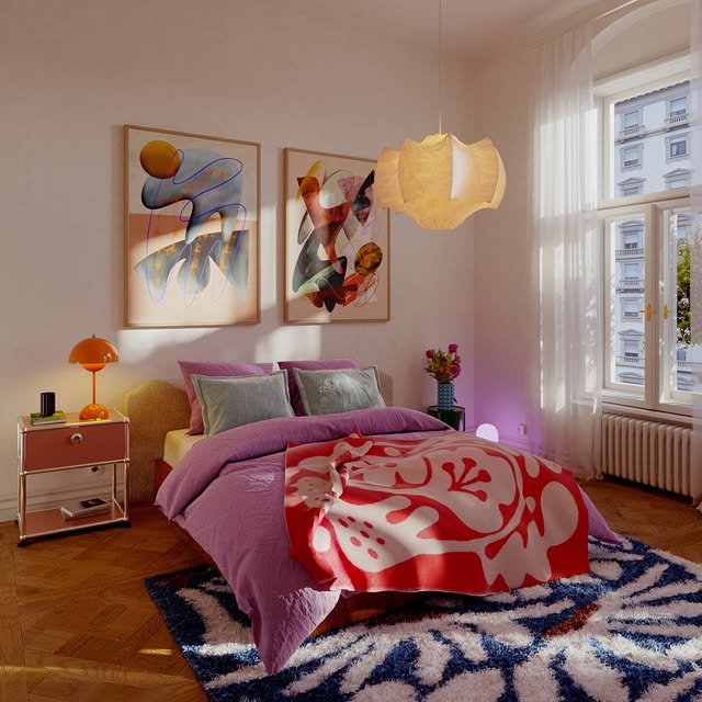 This eclectic style combines warm terracotta and soft blush tones with vintage frames, floral prints, and textured fabrics like velvet. Unique lighting fixtures such as fringed lamps and disco balls add a whimsical, layered effect that feels both cozy and curated.