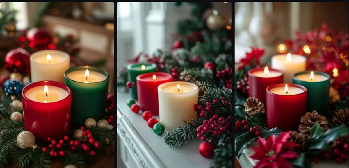 Inject a fun and festive spirit by wrapping white candles with red-and-white striped ribbons or placing them among bowls filled with candy canes. This classic color combination brings a cheerful, nostalgic energy to kitchens or children’s rooms, making the space feel joyful and welcoming during the holidays.