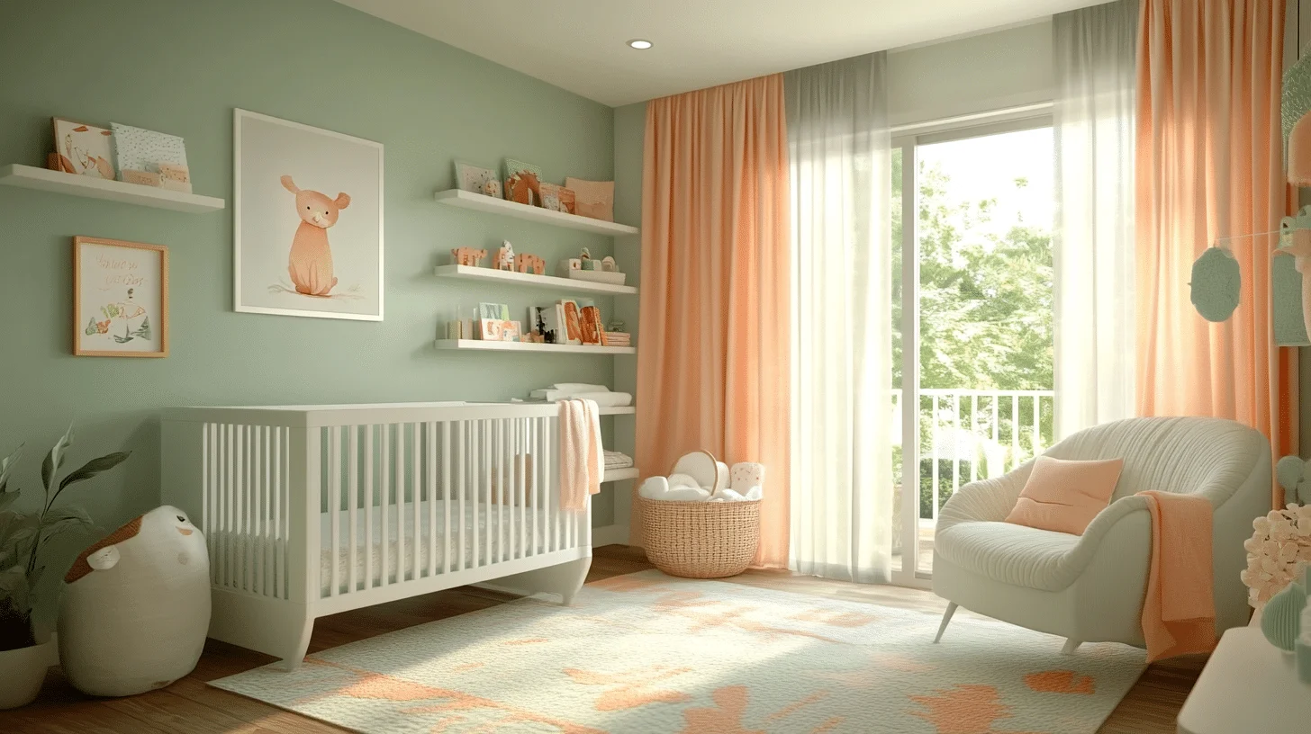 Create a tranquil haven with a palette of soft pastels such as mint, powder blue, and gentle pinks. Incorporate plush rugs and flowing curtains to enhance the cozy atmosphere. Complement the space with subtle wall art featuring delicate florals or gentle animals to add a refined touch.