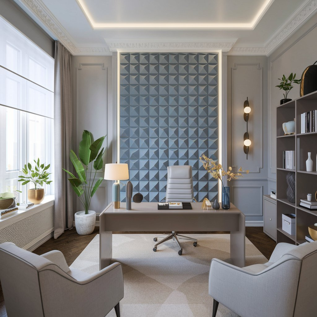 Creating a feature wall adds depth and personality to your office. Whether through a vibrant paint shade, textured wallpaper, or a curated gallery of artwork, this focal point sets the room’s mood.