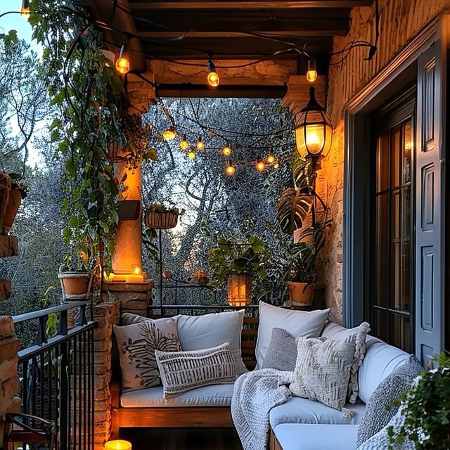 Soft lighting is key to crafting a magical boho atmosphere. String lights and delicate fairy lights draped along railings, overhead beams, or walls cast a gentle, inviting glow that transforms your balcony into a cozy retreat after sunset. These lights are easy to install and don’t take up any floor space, making them perfect for small balconies. For a whimsical touch, consider solar-powered options that are eco-friendly and hassle-free.