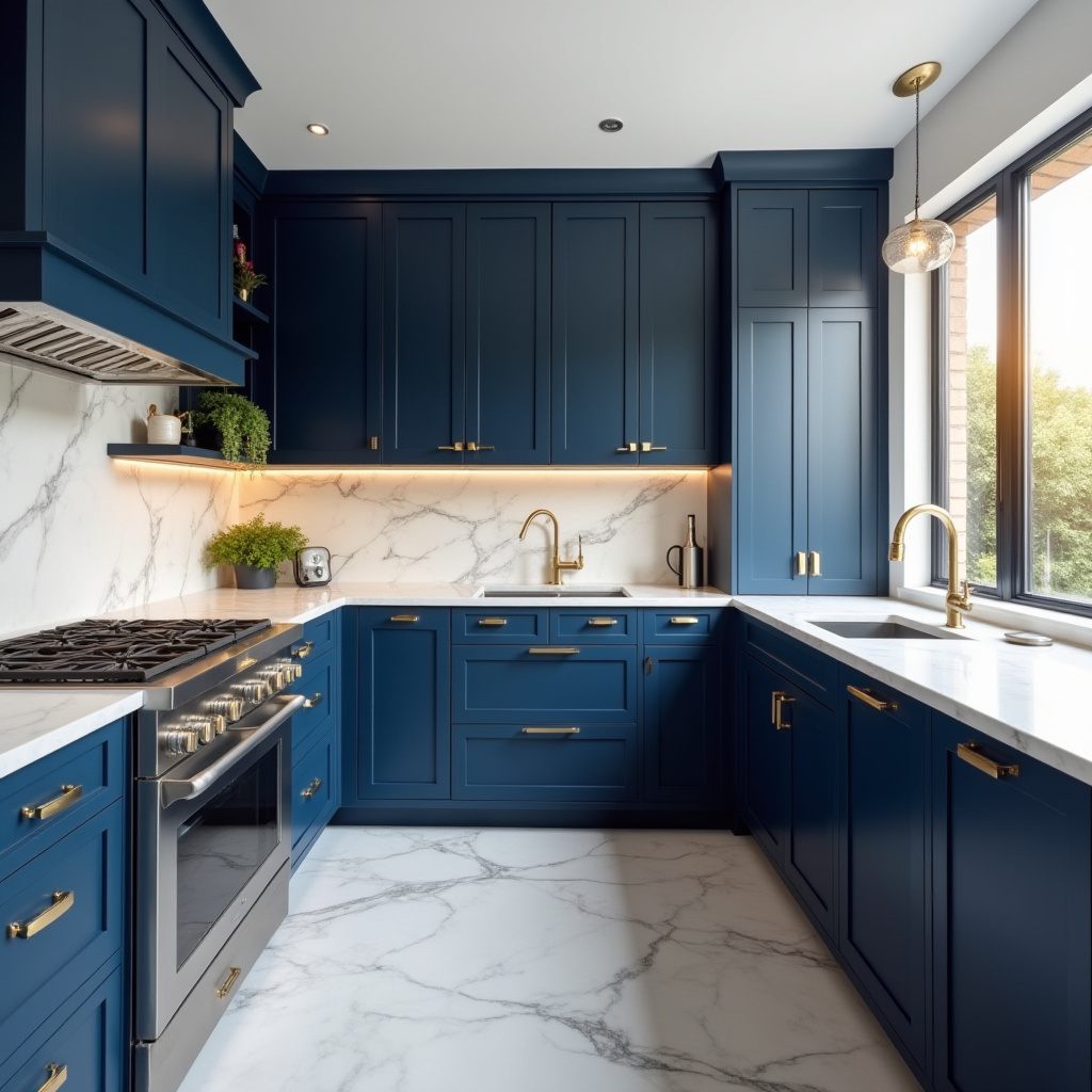 Embodying sophistication, this modern kitchen features deep navy cabinets contrasted with gleaming white marble countertops. The rich blue cabinetry forms a dramatic yet inviting backdrop, enhanced by natural light that accentuates the marble’s intricate veining.