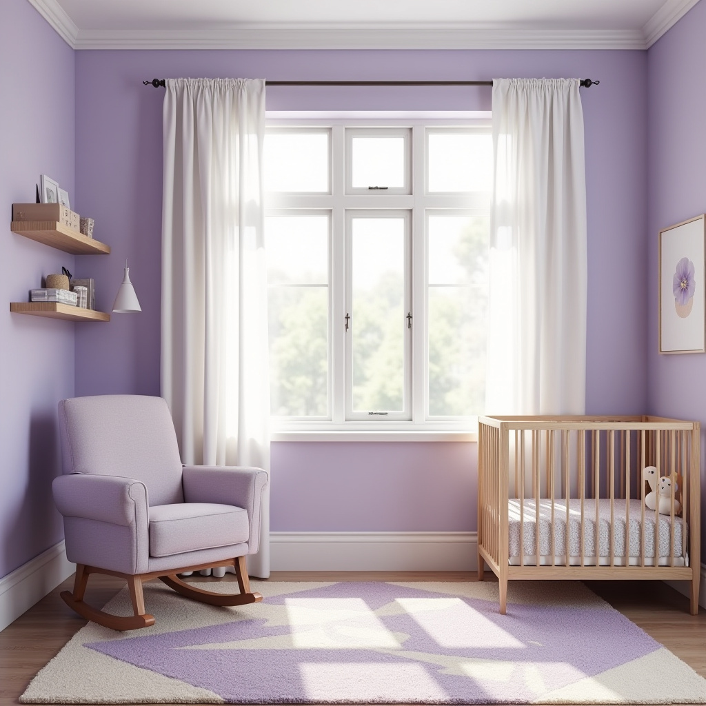 Soft lavender walls set a peaceful tone in this nursery, complemented by a lilac cushioned rocking chair positioned near a sunlit bay window draped with sheer white curtains. The natural light enhances the room’s soothing ambiance, perfect for quiet moments.