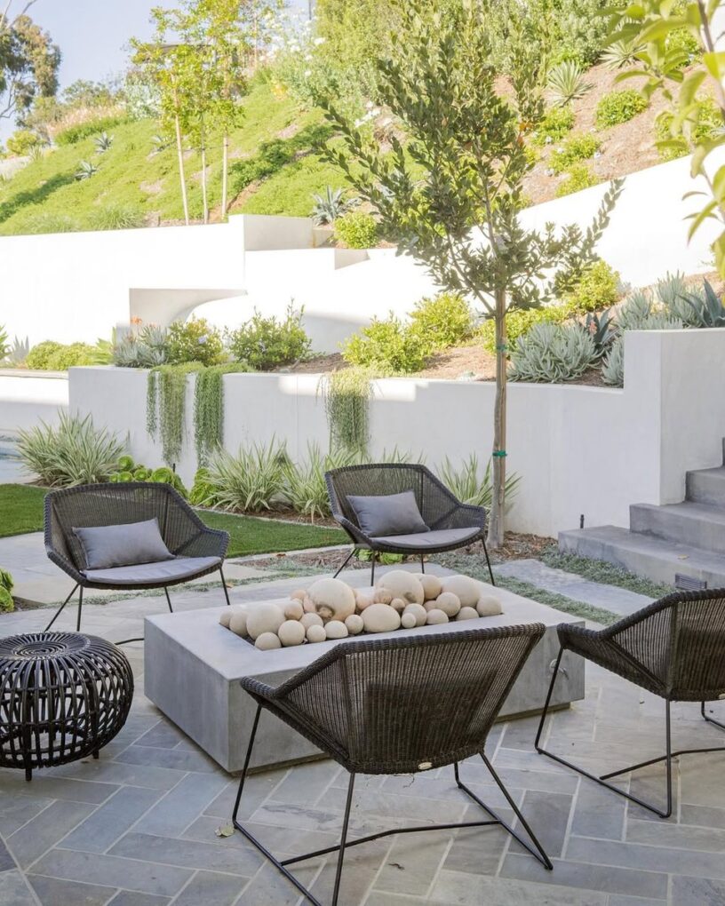 A sleek fire pit creates a warm, inviting centerpiece that encourages outdoor gatherings well into cooler nights. Surrounded by minimalist seating, it fosters a modern yet cozy environment. The flickering flames add ambiance without overwhelming the space, making it ideal for intimate chats or quiet reflection under the stars. Explore modern fire pits to enhance your patio.