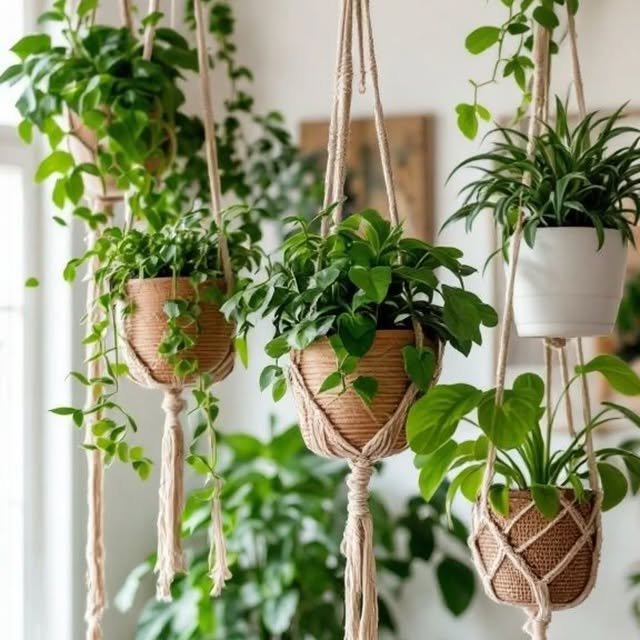 Hanging macramé planters introduce texture and vertical interest, adding a boho-chic vibe to your outdoor space. Suspended from pergolas or ceiling hooks, they showcase trailing plants without occupying floor area. The intricate knotting patterns provide a handcrafted feel, enhancing the relaxed and inviting atmosphere of your patio.