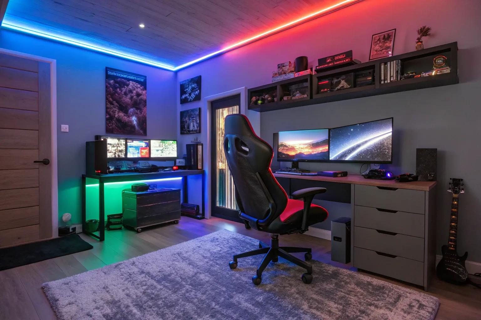 Install colored LED lights to craft an immersive ambiance. These lights can shift the room’s energy, mimicking the feel of a futuristic arcade.