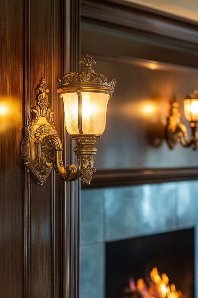 Picture antique brass sconces adorned with delicate scrollwork and floral designs flanking your hearth. The brass’s warm luster reflects light beautifully, accentuating the ornate craftsmanship. These fixtures pair wonderfully with plush fabrics, carved wood mantels, and vintage furnishings, creating a luxurious yet inviting atmosphere.