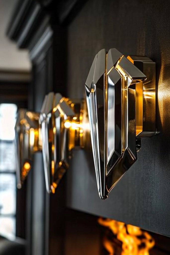 Envision brass or polished nickel sconces featuring angular, stepped designs reminiscent of the 1920s. When illuminated, they cast crisp shadows and bounce light, enhancing the room’s sophistication.