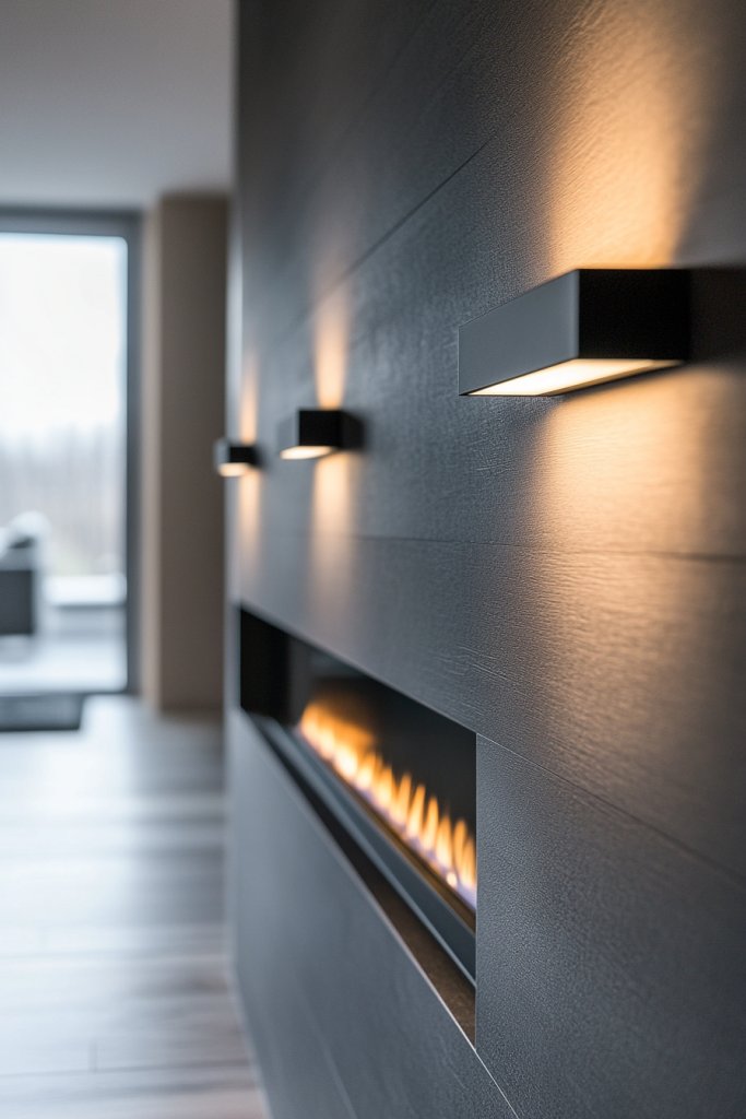 If ornate, busy lighting fixtures feel overwhelming in your modern home, minimalist black metal sconces offer a refined alternative. Their clean, streamlined design provides subtle illumination that enhances your fireplace without overpowering the decor. These fixtures emit a gentle, warm glow that highlights architectural features while maintaining a sophisticated ambiance.