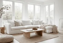 Replace standard blinds with sheer curtains in warm neutral tones. These allow natural light to filter softly, creating an open, airy feel that complements the earthy decor.