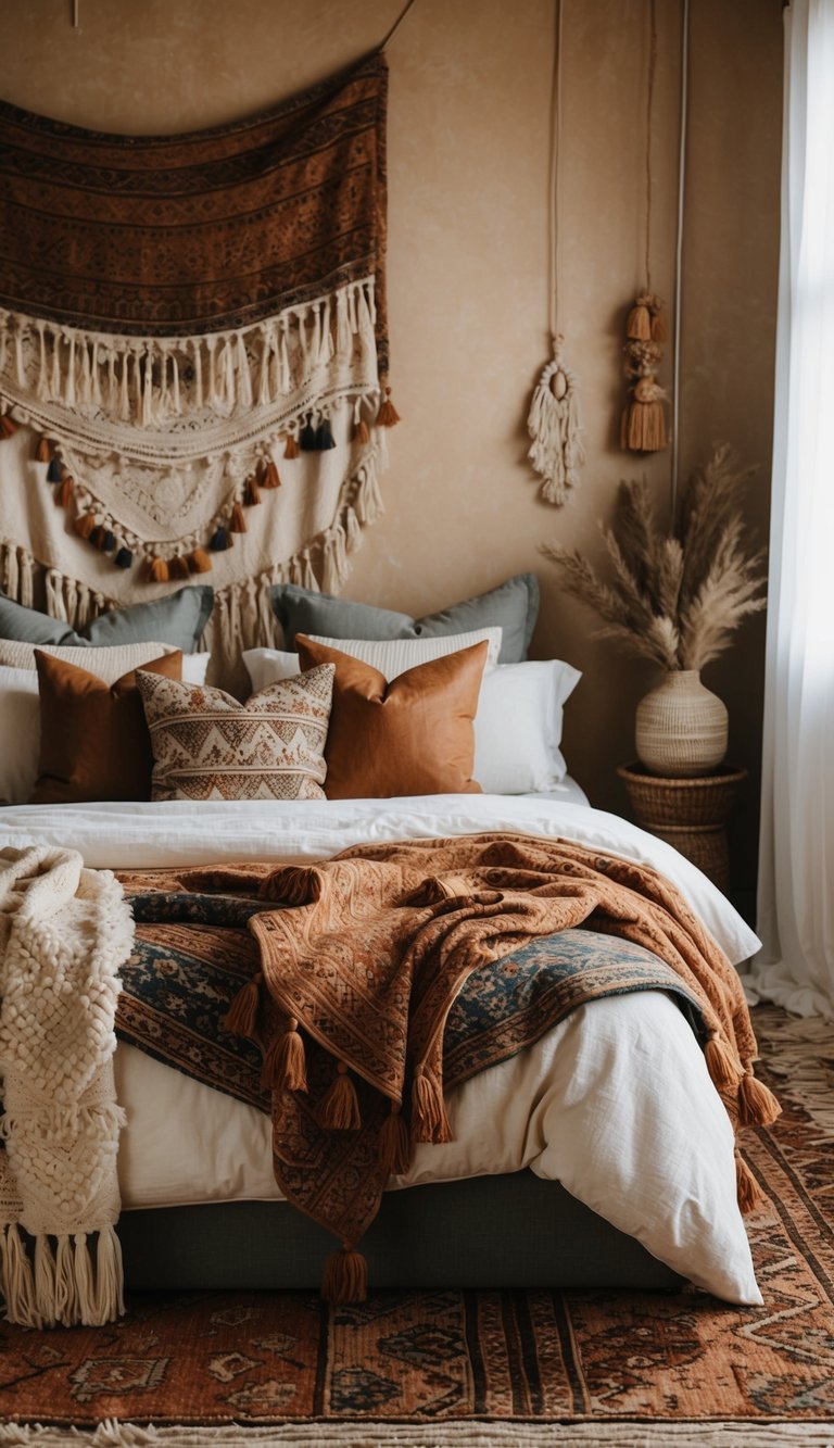 Adding layers of texture through soft throws and cushions enhances the warmth and comfort of your boho bedroom. Opt for chunky knit blankets, fleece throws, or woven fabrics with tassels and fringes to amplify the bohemian feel.