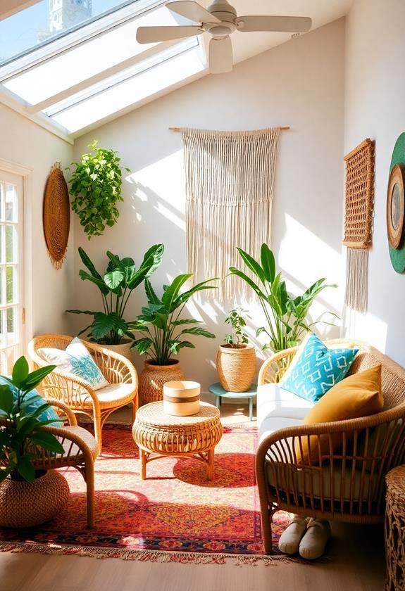 Visualize your home as a serene sanctuary where every boho element contributes to a vibrant, natural tapestry. Layered fabrics form the soft foundation, vintage rugs create inviting pathways, and rattan furniture weaves a cozy retreat. Macramé art flows like gentle vines, while Moroccan poufs and mosaic tiles whisper stories from afar. Together, these components craft a peaceful oasis where creativity and comfort coexist harmoniously.
