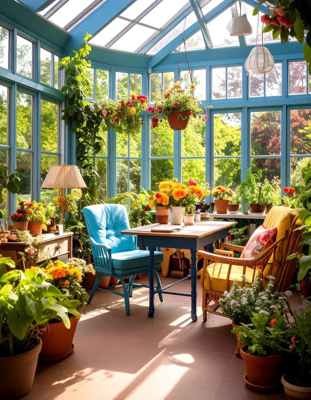 Infuse your sunroom with vibrant energy by embracing a bohemian style filled with rich colors, diverse patterns, and worldly accents. Place a carved wooden desk with intricate designs near the brightest windows, surrounded by colorful floor cushions for alternative seating. Hang macramé wall art and suspended planters at varying heights to add texture and greenery. Select a vintage rattan peacock chair or an upholstered seat in jewel tones as a statement piece. Layer Persian rugs, brass accessories, and lush plants like pothos and snake plants in decorative pots to create a lively, inspiring environment. This design nurtures creativity and self-expression, making it ideal for artistic work and innovative projects.