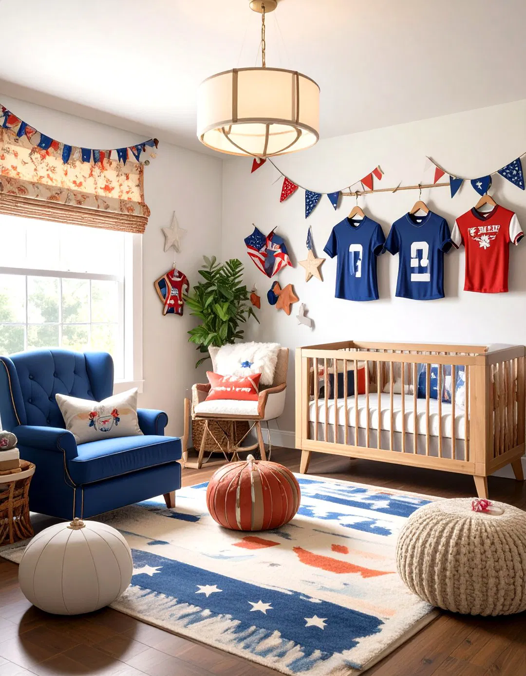 Bring the excitement of game day into your nursery with a football stadium-inspired design. Rich greens and earthy browns paired with your favorite team’s accent colors create an immersive field-like atmosphere. Soft crib linens featuring subtle football motifs ensure comfort while maintaining the sporty theme. Wall decals depicting players in action and field markings transform plain walls into dynamic scenes. Furniture reminiscent of locker room benches and training facilities adds authenticity, while vintage football plush toys and sepia-toned artwork soften the space with nostalgic warmth. This theme is ideal for families passionate about football culture and traditions.
