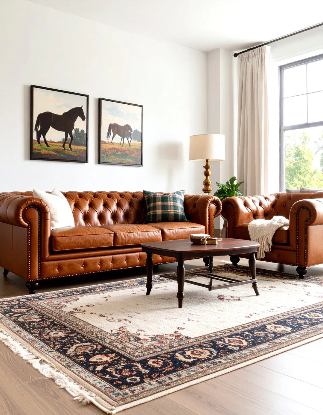 Immerse yourself in a refined equestrian-inspired living room where rich leather Chesterfield sofas in deep chocolate tones rest atop vintage Persian rugs featuring warm burgundy and gold hues. Dark wood bookcases showcase collections of horse sculptures, antique riding boots, and leather-bound tomes on equestrian lore. Walls are adorned with oil paintings depicting thoroughbred horses and classic fox hunting scenes, while brass accents shaped like stirrups and bits add authentic equine details. Complementary plaid cushions in forest green and navy, alongside tartan throws, enhance the cozy yet sophisticated atmosphere. A distressed leather trunk serves as a coffee table, topped with equestrian magazines and a crystal decanter set, celebrating the timeless bond between heritage and horsemanship.