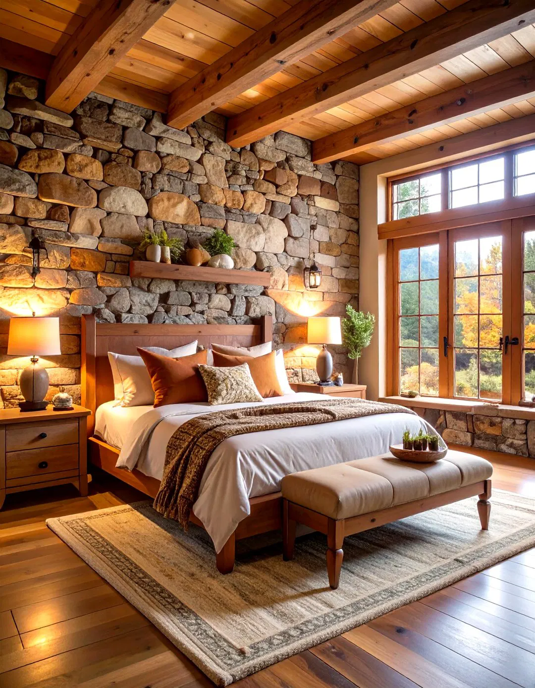 Elevate your bedroom’s atmosphere with a striking stone accent wall that evokes the essence of a mountain lodge. Opt for stacked fieldstone or river rock veneers to introduce tactile depth and natural variation that shifts with daylight. Pair this rugged backdrop with warm wooden furnishings and bedding in earthy tones like sage, cream, and taupe. Illuminate the space with wrought iron sconces mounted directly on the stone, casting a soft glow that enhances the room’s cozy, nature-inspired ambiance.