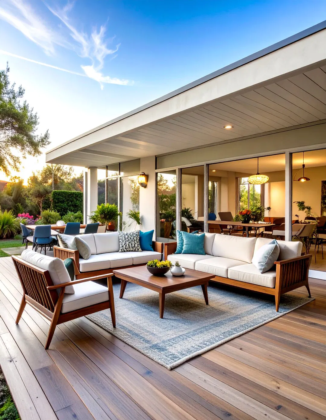 Characterized by horizontal lines and post-and-beam construction, this veranda reflects 1950s innovation. Exposed aggregate concrete flooring supports furniture with tapered legs and geometric shapes. Expansive windows and sliding doors maximize natural light and outdoor views. Built-in planters feature architectural plants like bird of paradise, while pendant lights inspired by atomic-age designs add flair. The earthy color palette with bold accents such as burnt orange evokes a casual California vibe, ideal for ranch-style or contemporary homes embracing indoor-outdoor living.