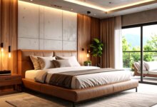 This bedroom channels the relaxed charm of Mediterranean coastal villas, featuring whitewashed walls that serve as a crisp canvas for natural textures and earthy accents. The bed’s wrought iron frame is dressed in crisp white linens, while terracotta pottery and textiles introduce warmth. Elements like marble nightstands and limestone accent walls echo Mediterranean architecture, complemented by blue and white striped fabrics that evoke seaside breezes. Olive wood furnishings add organic depth, and where possible, curved archways enhance the villa feel. This design cultivates a sun-drenched, tranquil atmosphere that captures the essence of coastal living.
