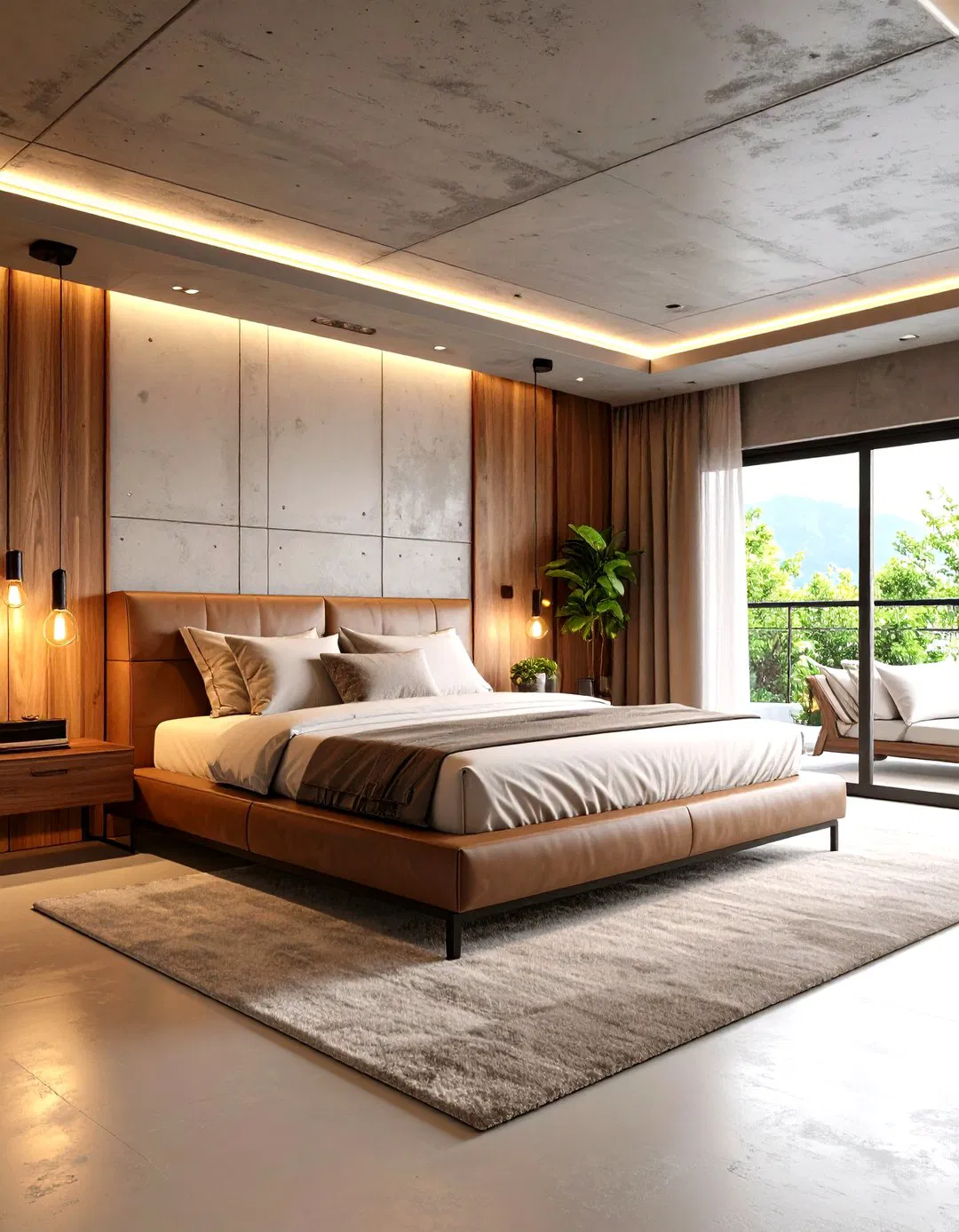Blending urban industrial aesthetics with nautical refinement, this yacht bedroom features exposed structural elements and raw finishes. Polished concrete contrasts with warm wood accents, while black steel fixtures add a bold, masculine edge. The platform bed combines metal framing with leather upholstery, creating a striking centerpiece. Edison bulb lighting fixtures provide ambient glow with industrial flair. Structural beams are showcased rather than concealed, celebrating the vessel’s engineering. Weathered wood and aged metal finishes add authentic texture, while a palette of grays and charcoals maintains a sophisticated, contemporary vibe. This design appeals to those who favor modern architectural influences in their maritime retreats.