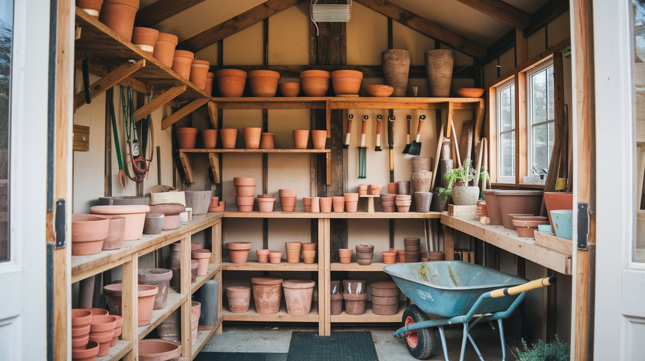 Merge functionality by designing a hybrid potting shed and greenhouse. Incorporate transparent polycarbonate or glass panels on one side to maximize sunlight, while reserving shaded zones for tool storage and repotting tasks.