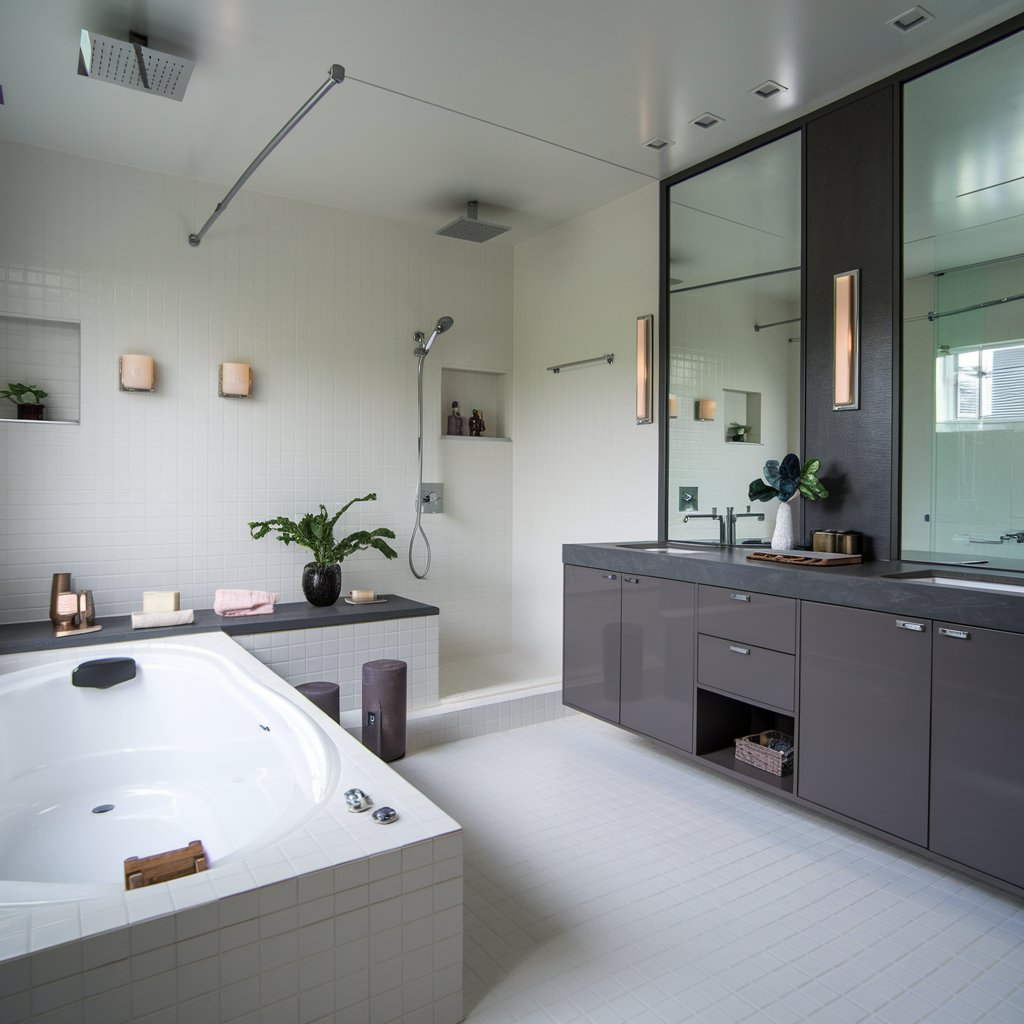 Enhance practicality with built-in shelving, recessed cabinetry, or floating wall shelves. Mirrored cabinets are a smart choice, offering concealed storage while maintaining a sleek appearance.