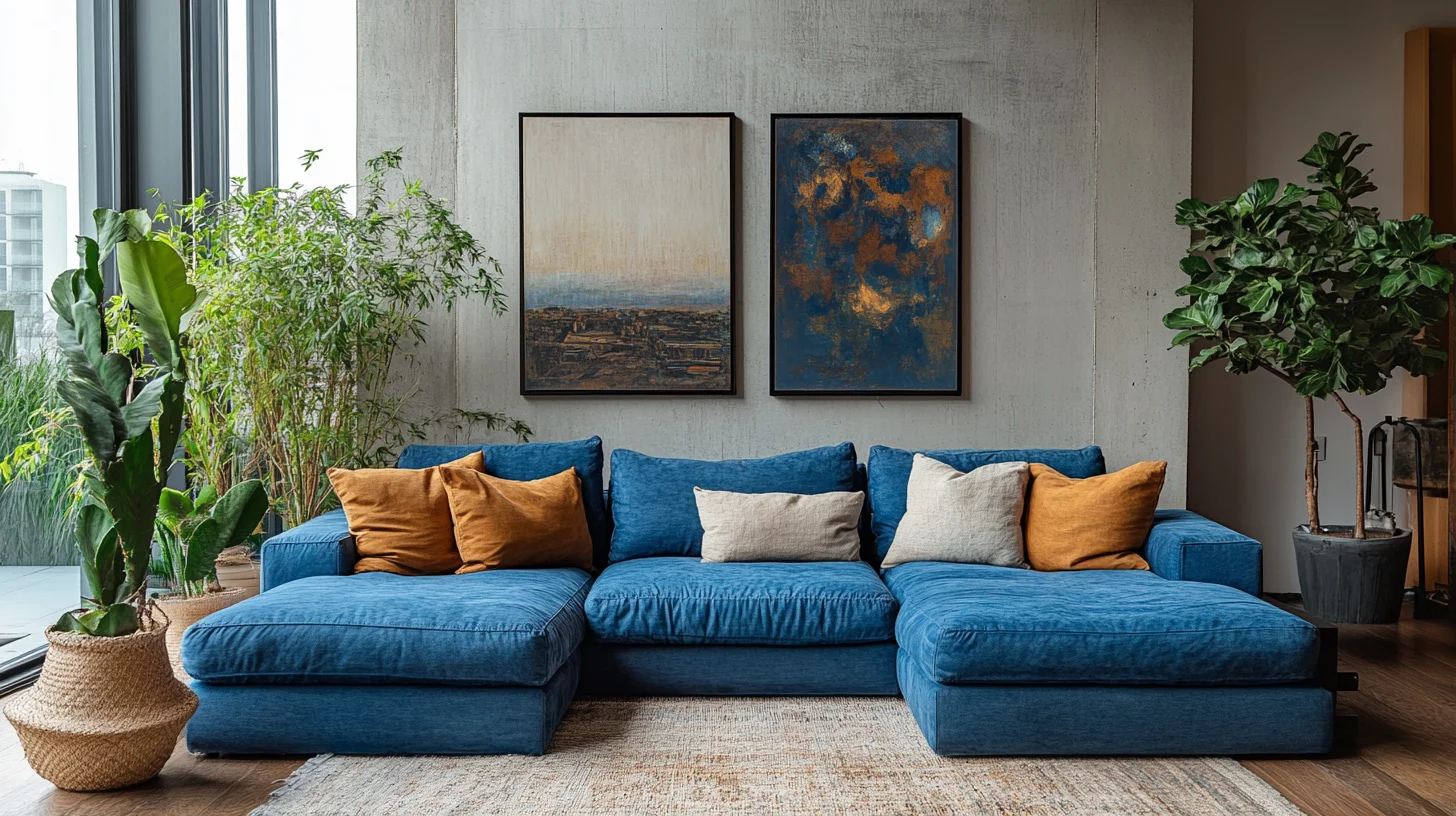 Design a welcoming lounge area with a large blue sofa that encourages conversation and relaxation. Ample seating and plush cushions make it ideal for hosting guests. Keep walls neutral to maintain brightness and balance the boldness of the sofa.