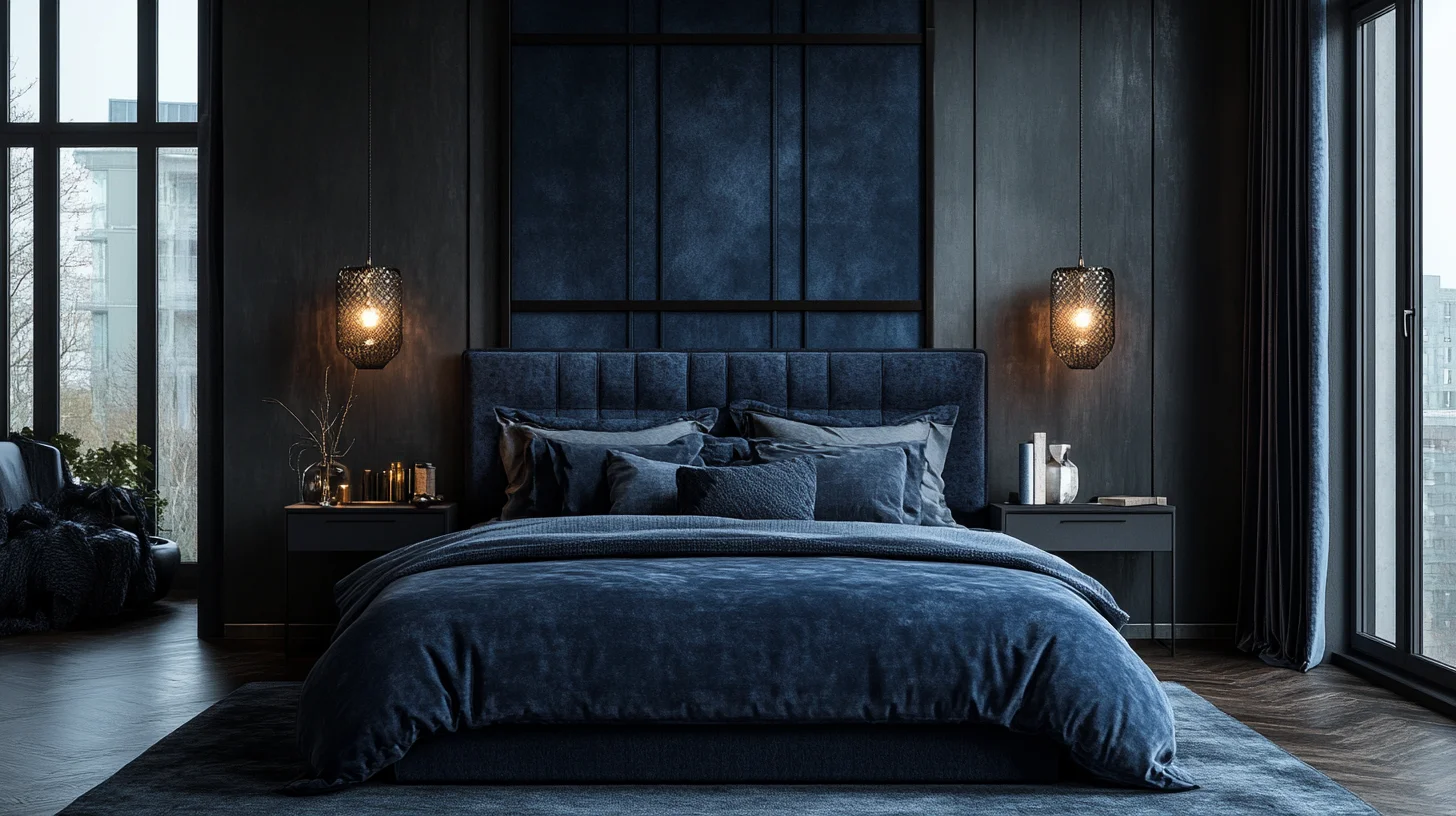 Deep navy and black shades establish a serene, structured dark boho bedroom. Minimalist accessories emphasize clean lines and soft textiles, creating a poetic and introspective space. This design is a sanctuary for creative minds seeking understated elegance.