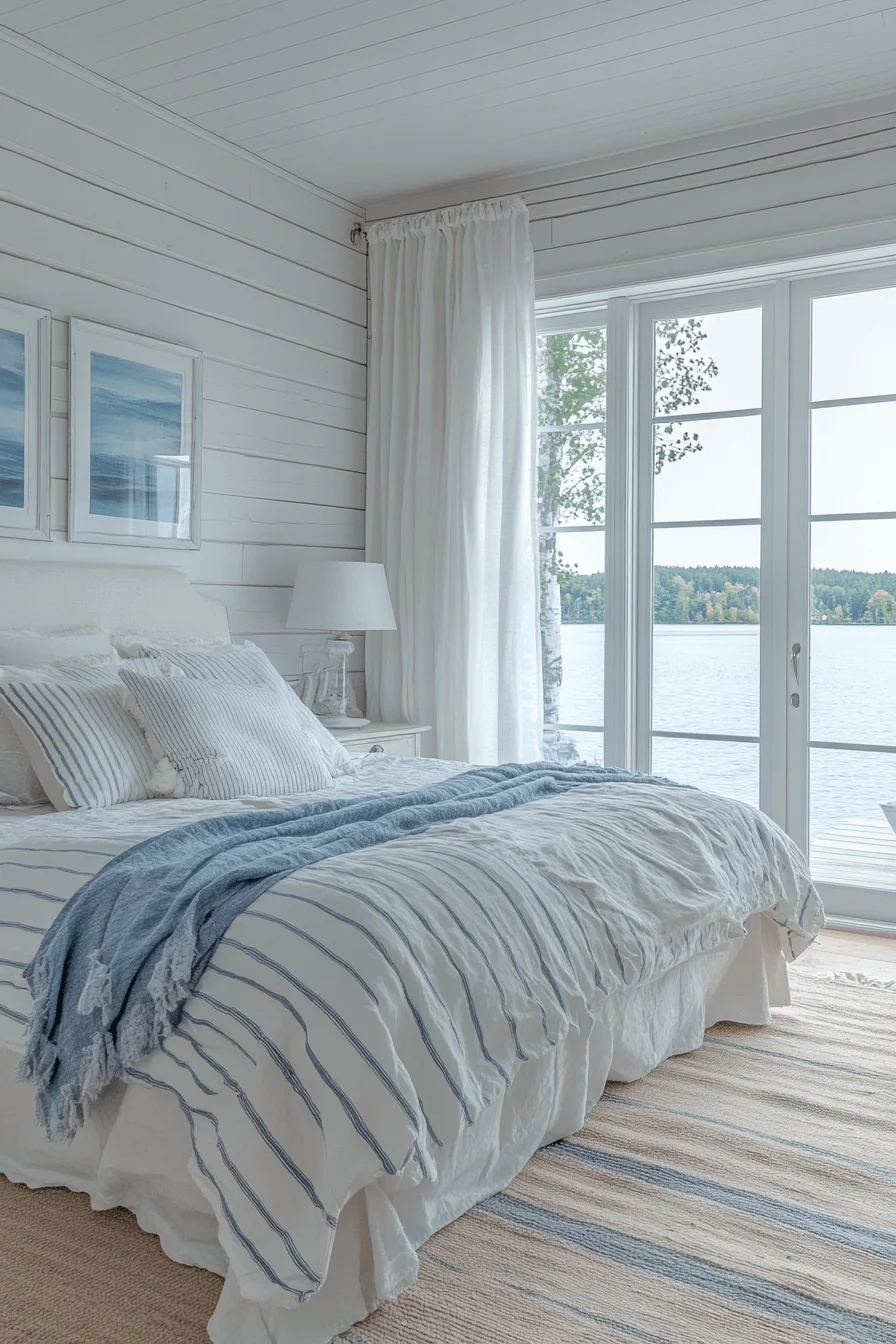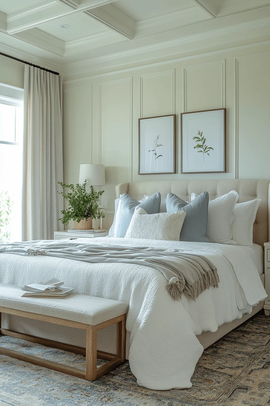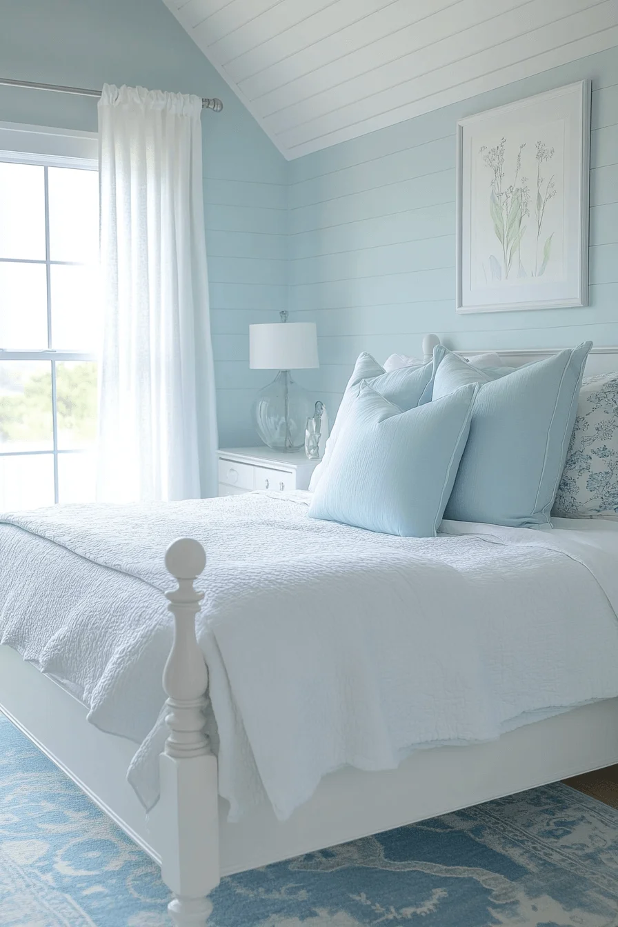 Soft blues and creamy neutrals paired with minimal decor cultivate a tranquil environment. Layered bedding invites relaxation, while the overall design encourages calm and mindfulness.