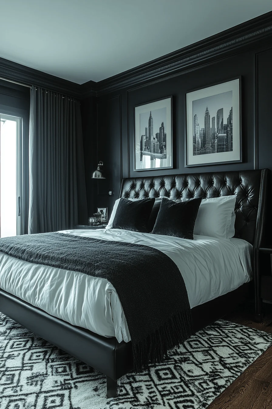 City-inspired guest rooms combine dark wood tones, modern artwork, and sleek lighting to create a refined yet cozy environment. Luxurious bedding softens the space, making it a perfect urban retreat for visitors.