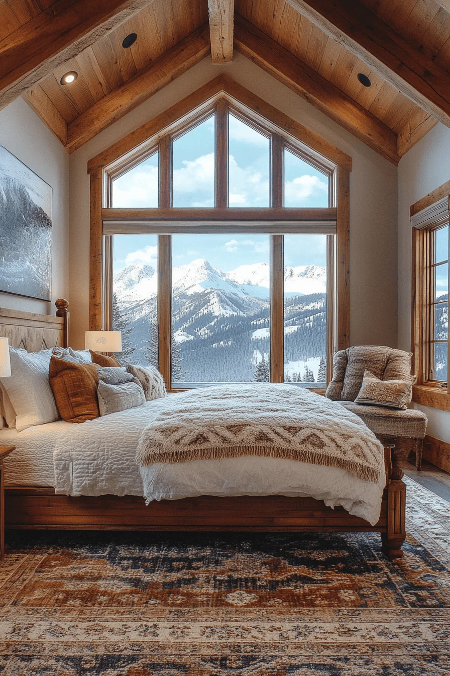 Bring alpine coziness indoors with rugged wood finishes, flannel textiles, and warm ambient lighting. This style combines rustic charm with refined comfort, perfect for a mountain-inspired guest room.