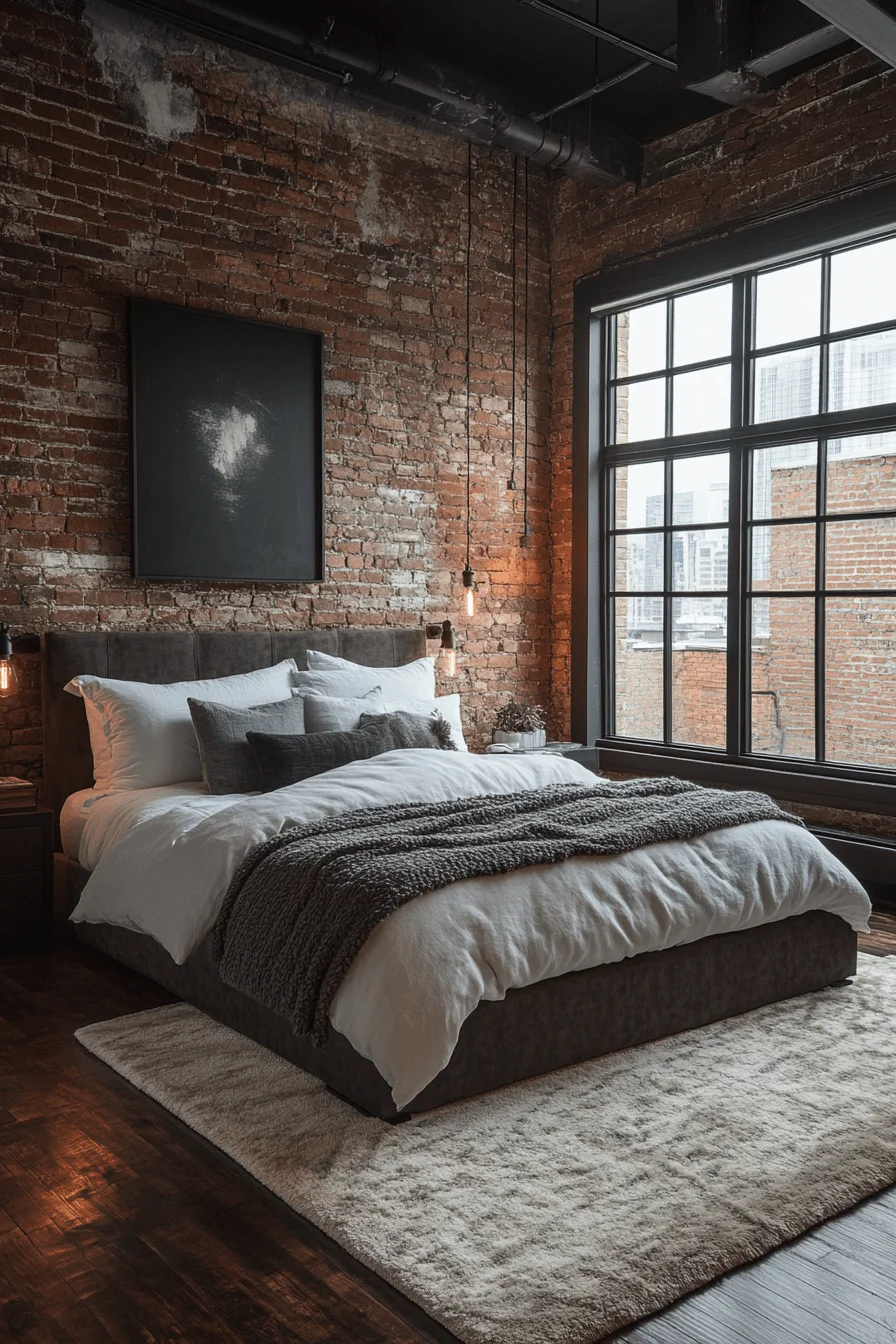 Industrial design elements like exposed beams, metal fixtures, and expansive windows create a bold statement. Soft furnishings and warm tones balance the rawness, resulting in a stylish and comfortable guest space.