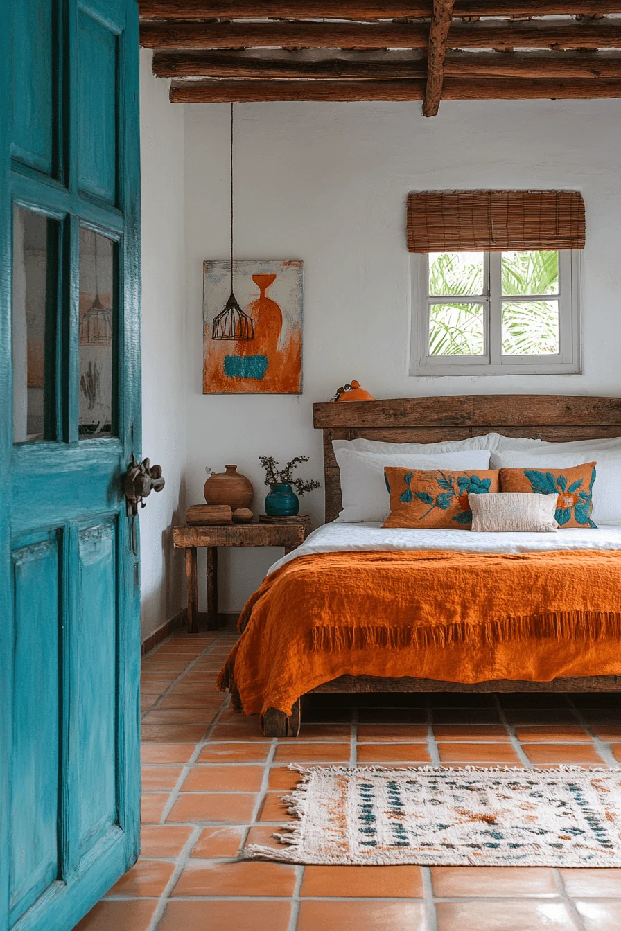 Inspired by Mediterranean aesthetics, this guest room features whitewashed walls, blue tile accents, and terra-cotta details. The abundant natural light and simple elegance create a warm, inviting space.