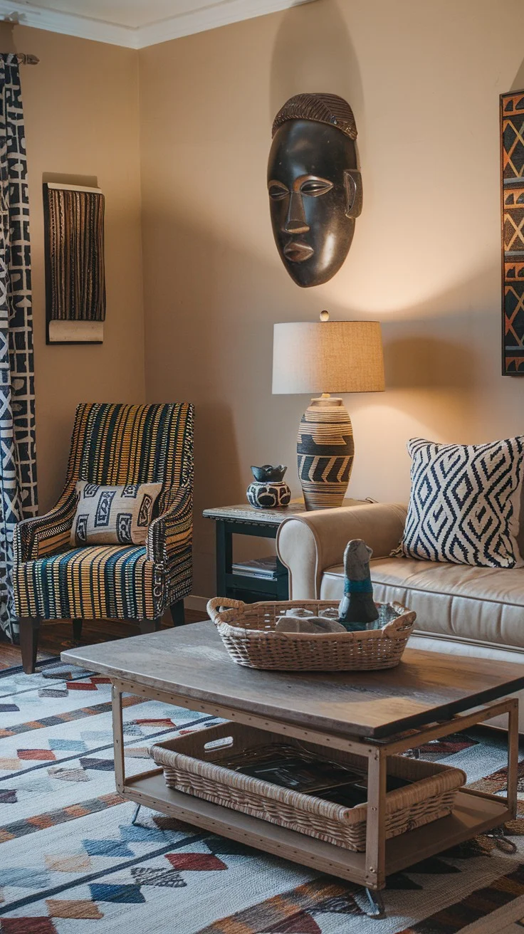 Feature a large dark African mask as a striking cultural centerpiece. Pair a light leather sofa with geometric black and white pillows for contrast and softness. A striped armchair adds complementary patterning. A patterned table lamp provides warm ambient light. A large geometric rug with colorful shapes grounds the space in dynamic cultural richness.