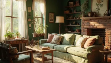 - Accents: Velvet poufs, lacquered trays, and stacked art frames