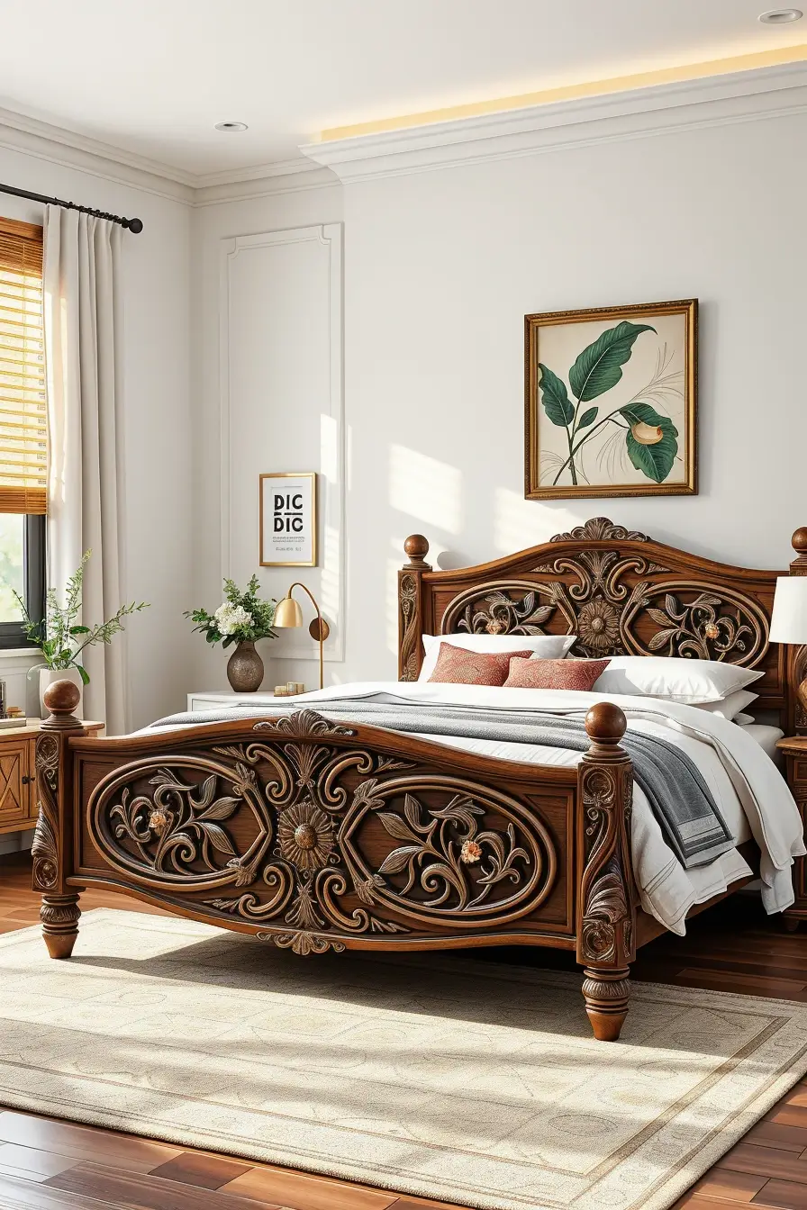 To let the carvings stand out, keep surrounding decor minimal with plain bedding and subdued lighting. House Beautiful reports a resurgence in appreciation for carved wood furniture, blending tradition with modern design. Adding subtle metal inlays or matte finishes can update this style for today’s tastes.