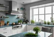 When picking colors, lighter tones such as soft creams, pale grays, or muted greens can open up the room and create a calming atmosphere, especially in compact kitchens.