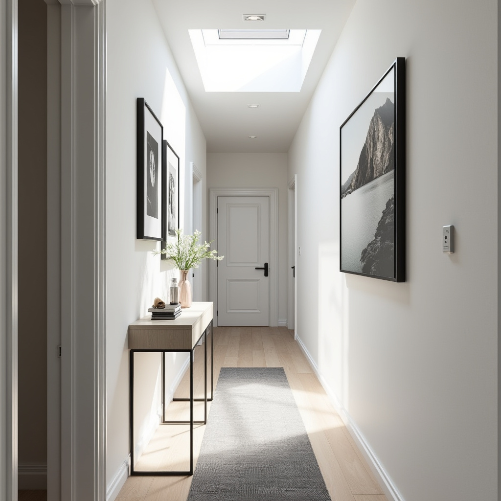 This design embraces a modern minimalist approach, featuring a monochrome gallery wall that contrasts strikingly with a soft grey runner. A floating console crafted from white oak with slender metal legs adds elegance while preserving an uncluttered environment.