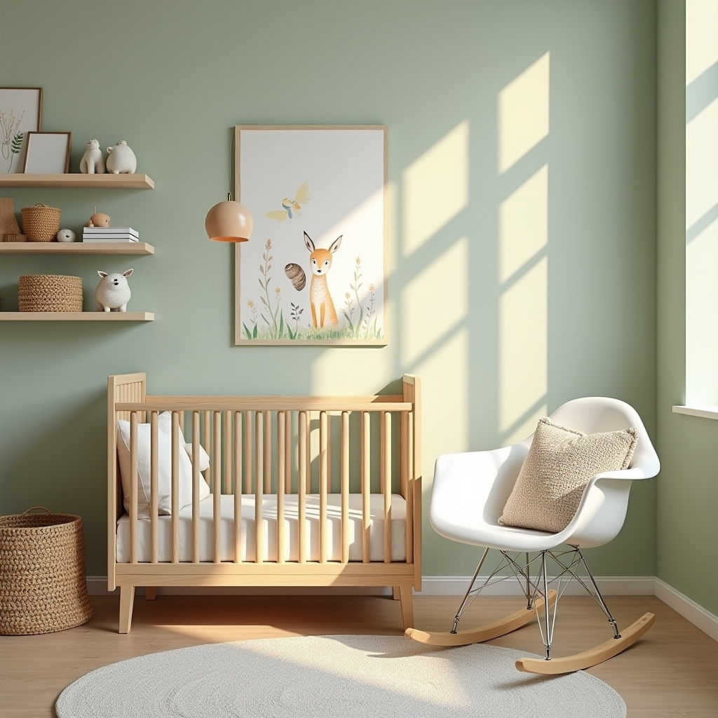 This design centers on a calming sage green feature wall embellished with hand-painted forest creatures, creating a serene woodland vibe. The natural oak crib introduces warmth, complemented by a white linen rocking chair adorned with a textured cushion for parental comfort.
