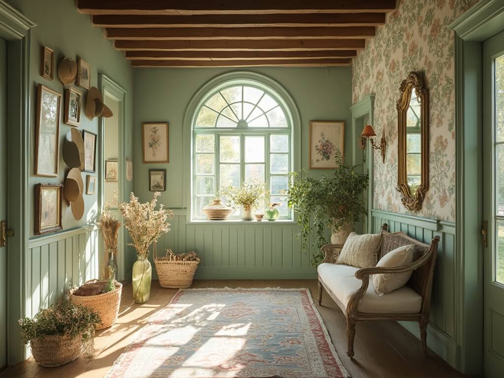 Vintage-inspired entryway with sage green walls, original hardwood floors, antique oak bench with cream cushions, botanical print gallery wall, round mirror, straw hats on coat rack, and wildflowers in vases bathed in late morning light