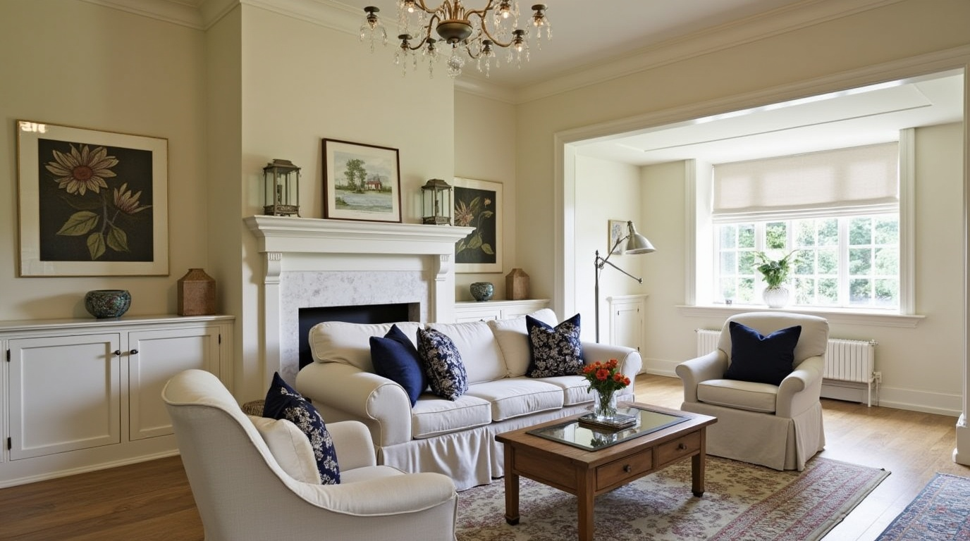Soft, muted tones dominate cottage palettes. Shades like creamy whites, warm beiges, dusty blues, and muted greens mirror the serene English countryside, fostering a peaceful and inviting atmosphere.