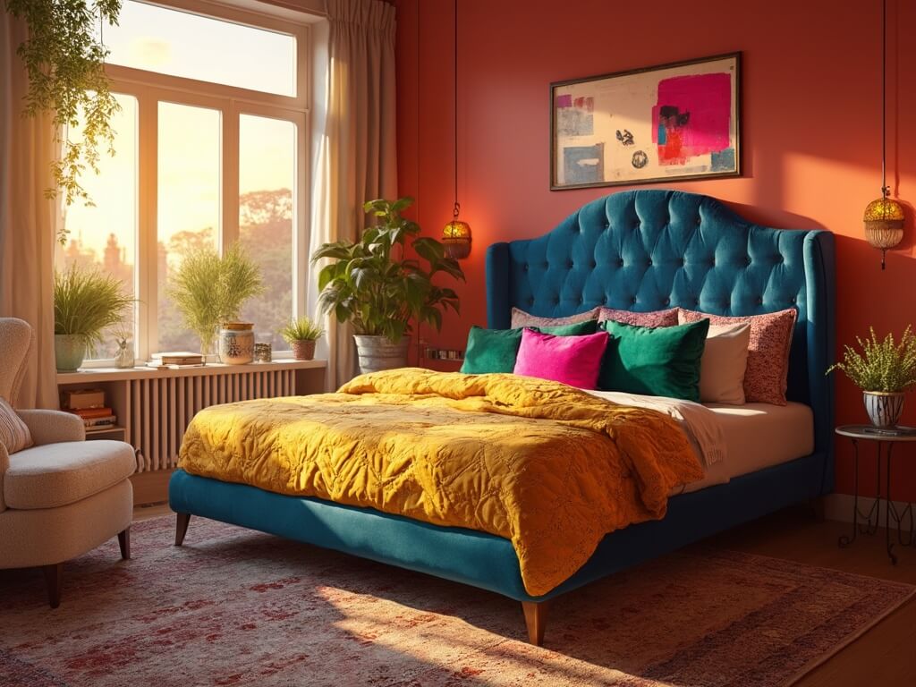 - A bed with a striking, colorful headboard