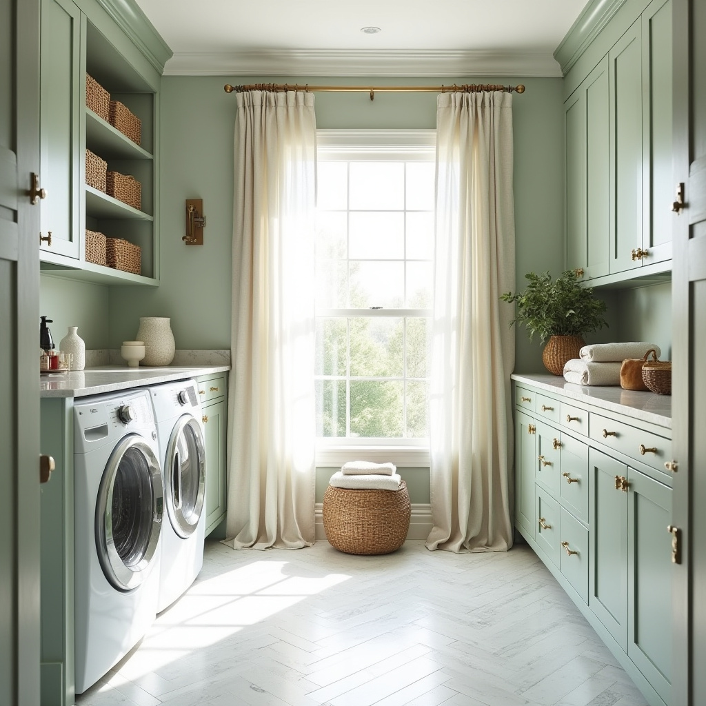 Woven baskets offer stylish storage, and brass accents elevate the overall aesthetic. Soft, diffused lighting enhances the inviting atmosphere, making laundry a more pleasant experience.