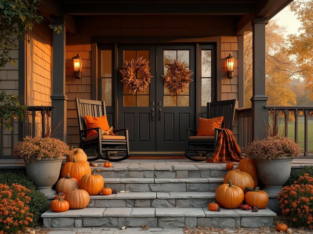 Front porch bathed in golden light with autumnal decorations including a wooden door adorned with a wreath of eucalyptus, wheat, and dahlias, rocking chairs with orange cushions, buffalo plaid throws, and heirloom pumpkins arranged on steps alongside copper lanterns with LED candles