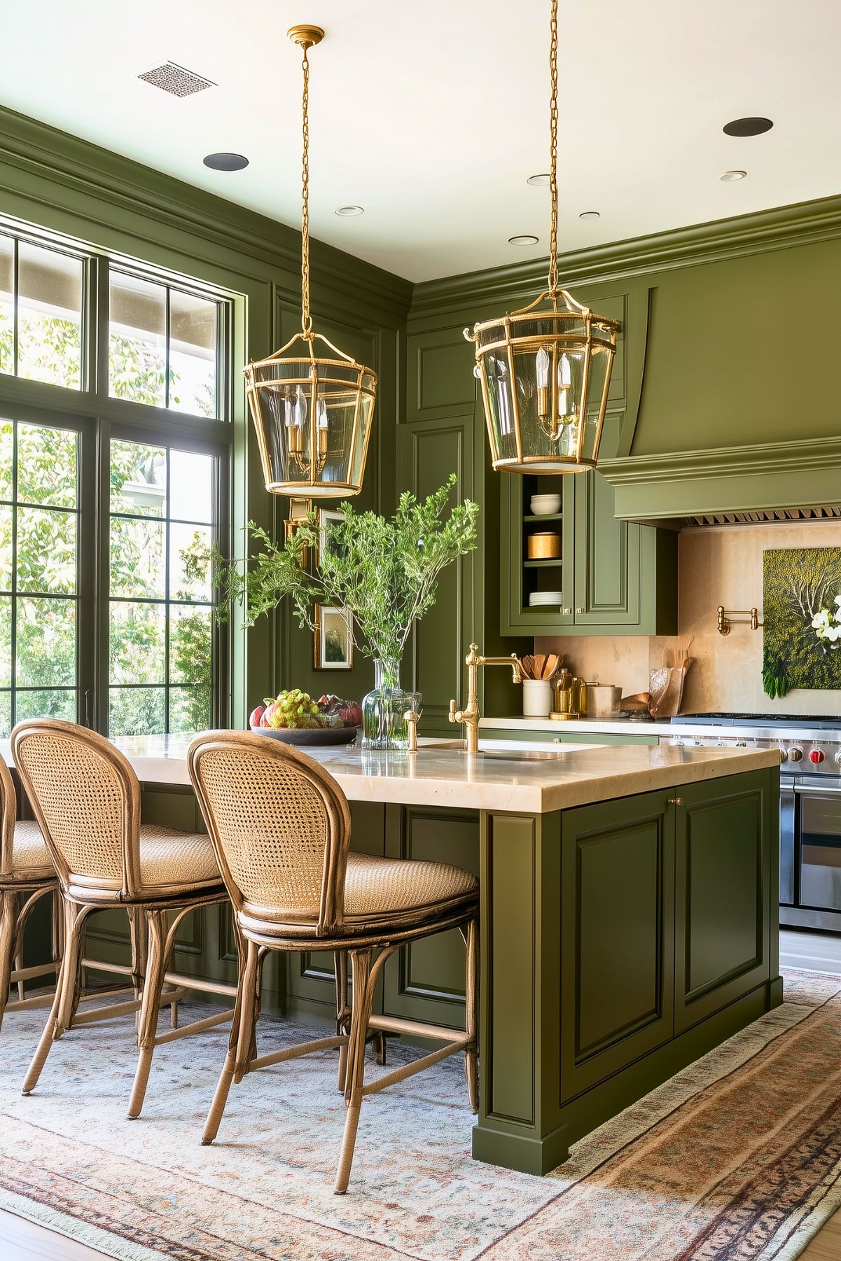Integrating olive green can be achieved through various elements: from full cabinetry coverage to accent walls or islands painted in this rich tone.